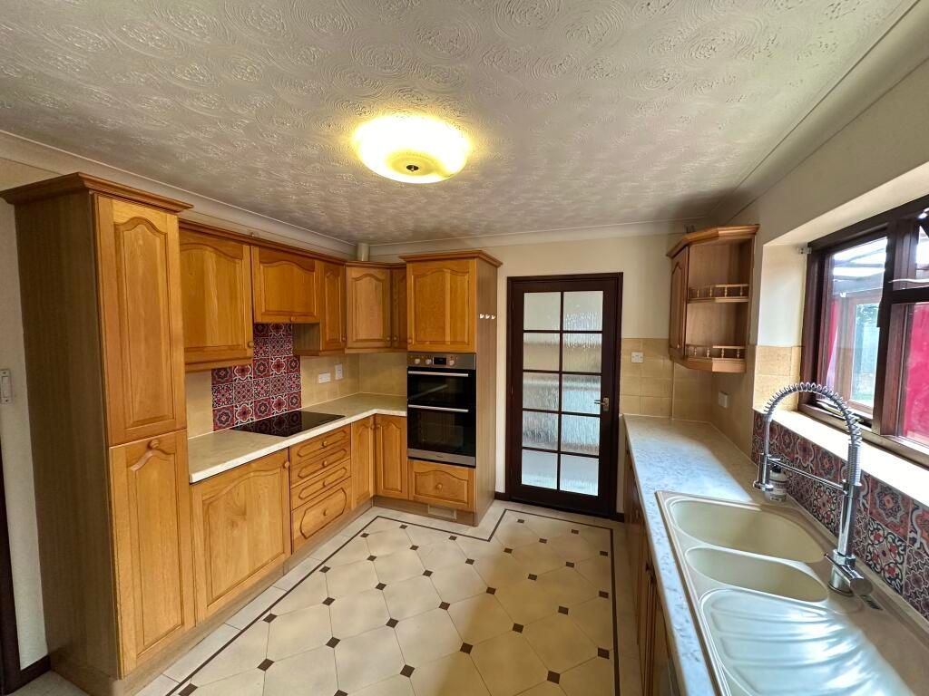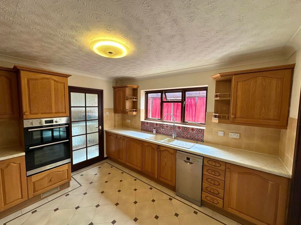 Offering a range of wooden floor and wall units, with built in oven, hob and extractor there is also a built in slim line dishwasher and fridge