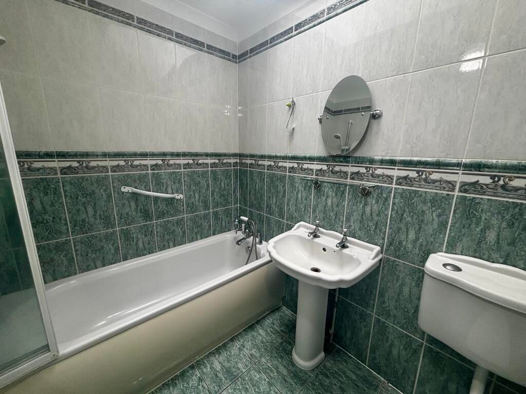 Tiled flooring and walls, low level flush WC, handwash basin, bath with electric shower over and shower screen, extractor fan, airing cupboard, skylight.