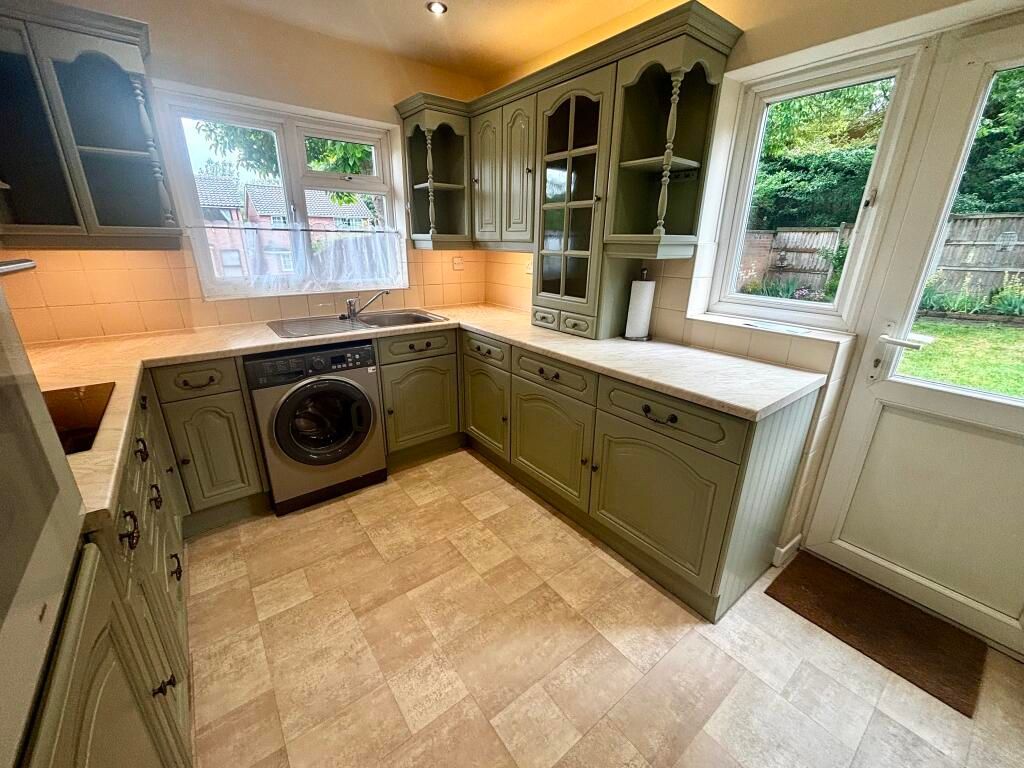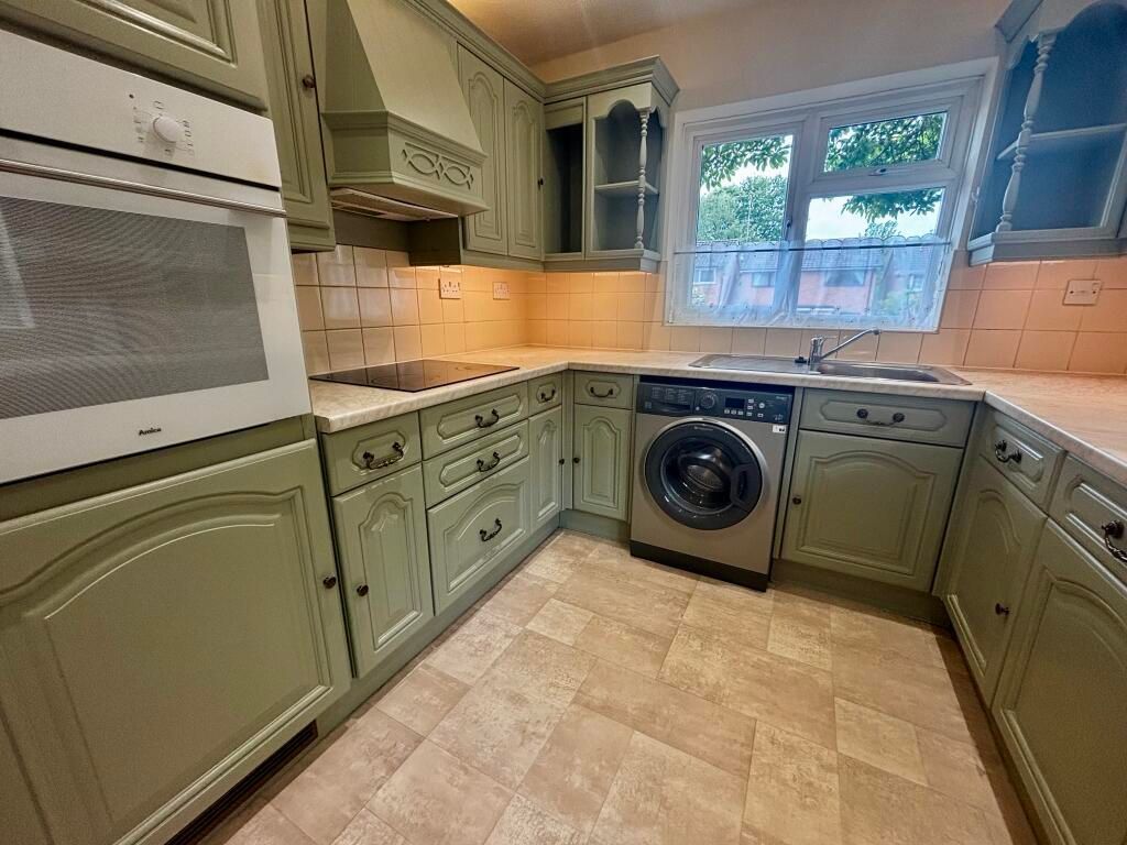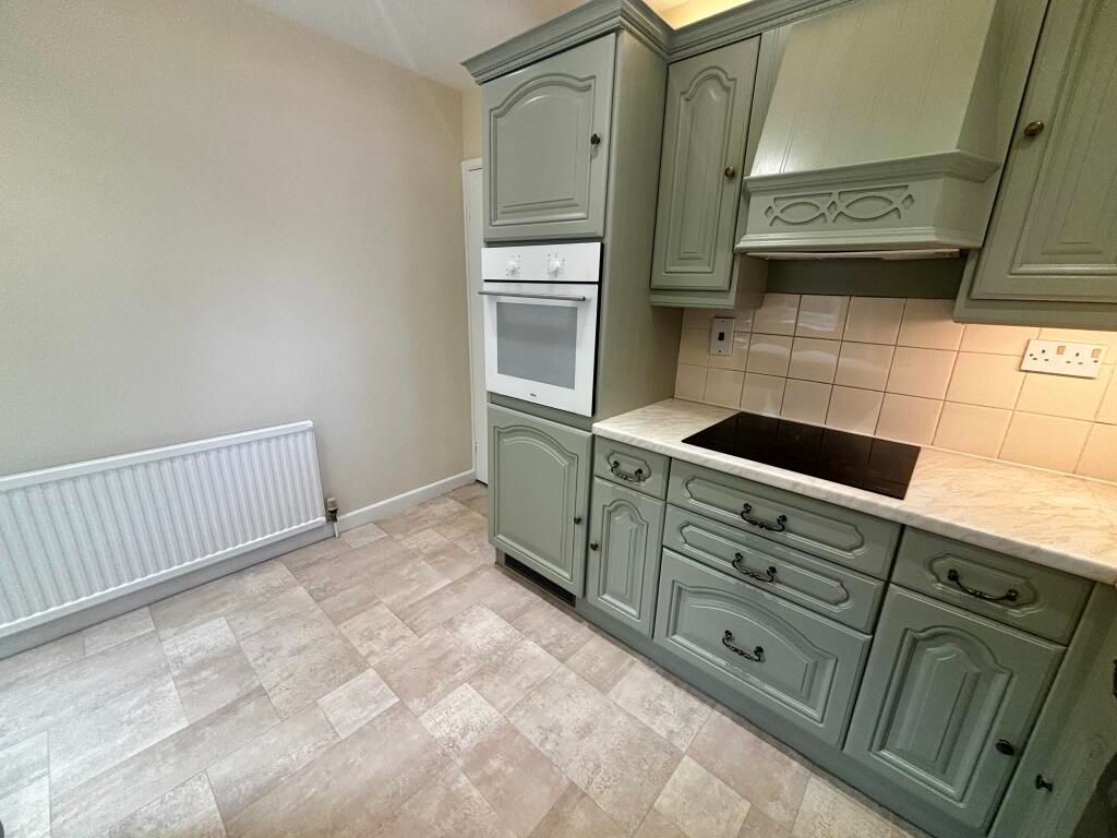 Vinyl flooring, eye and base level units, integrated fridge, freezer, oven and electric hob with extractor hood over, inset stainless steel sink with drainer, door to rear aspect, window to side aspect.