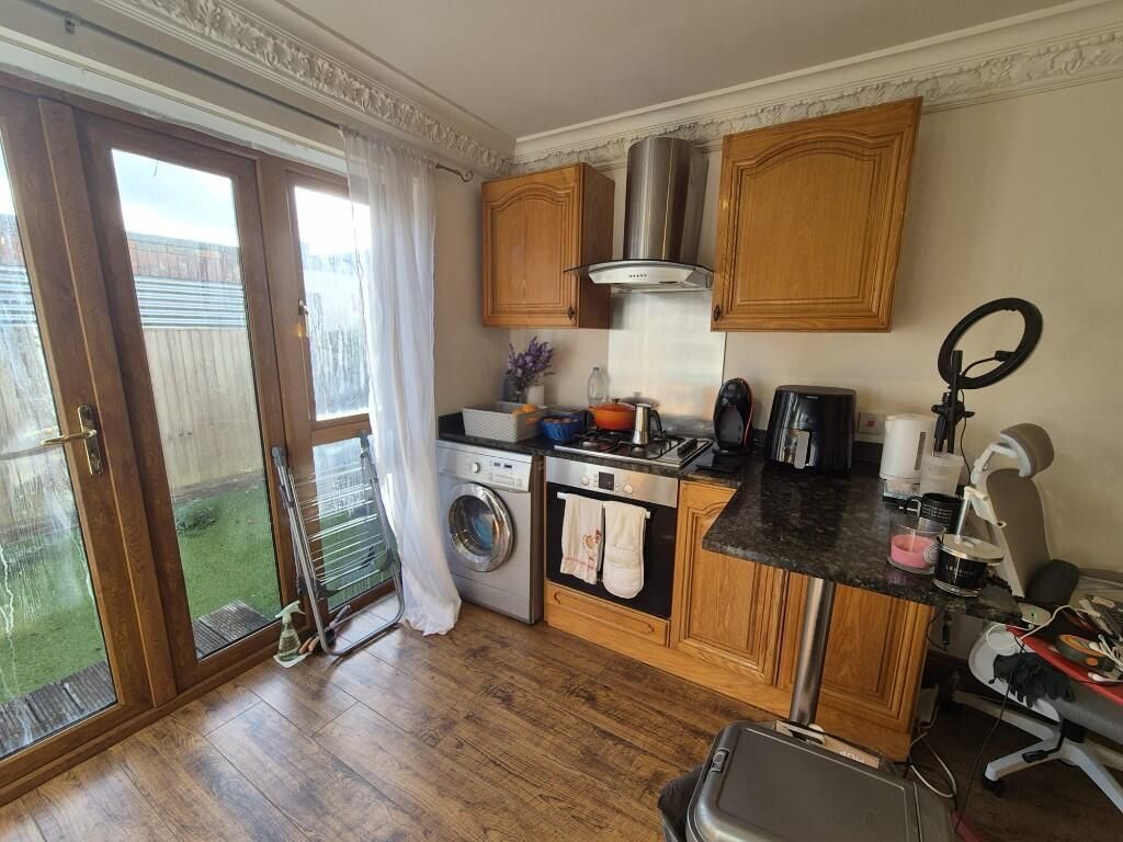 Kitchen Area Laminate floor. Range of wall and base units with complimentary worktops. Fridge freezer, washer machine, oven, hob with extractor over.