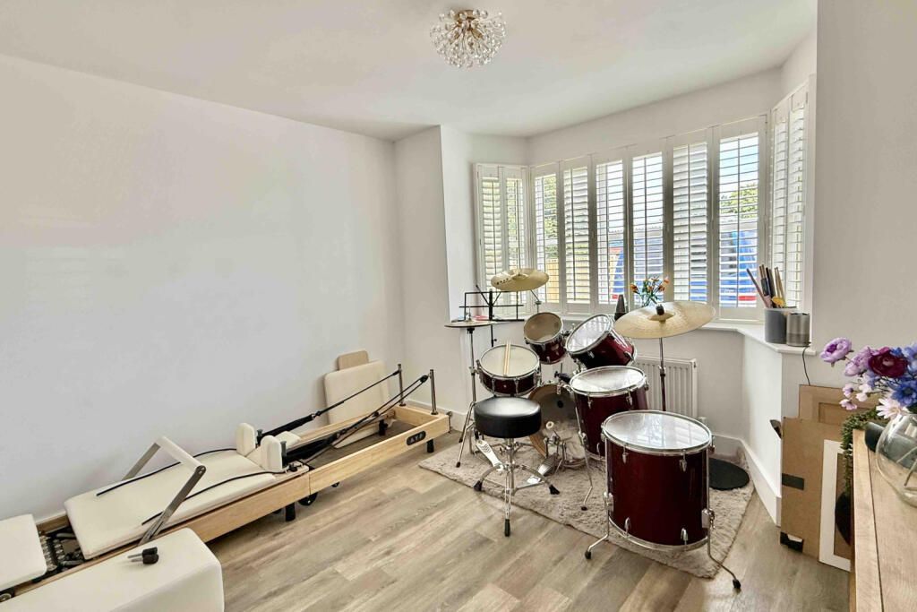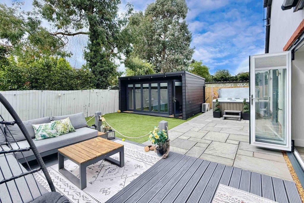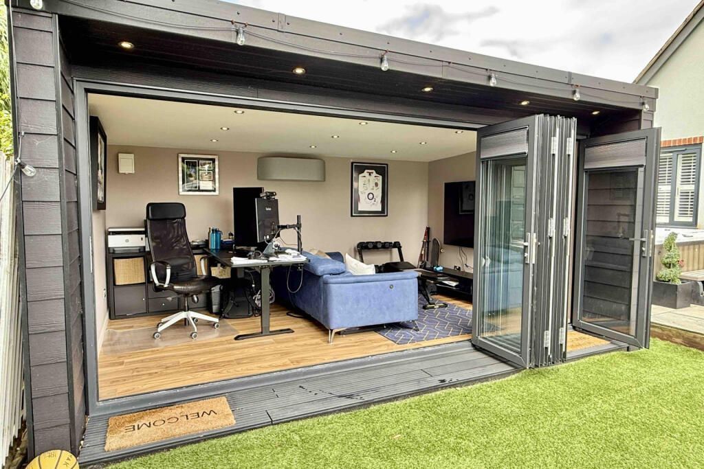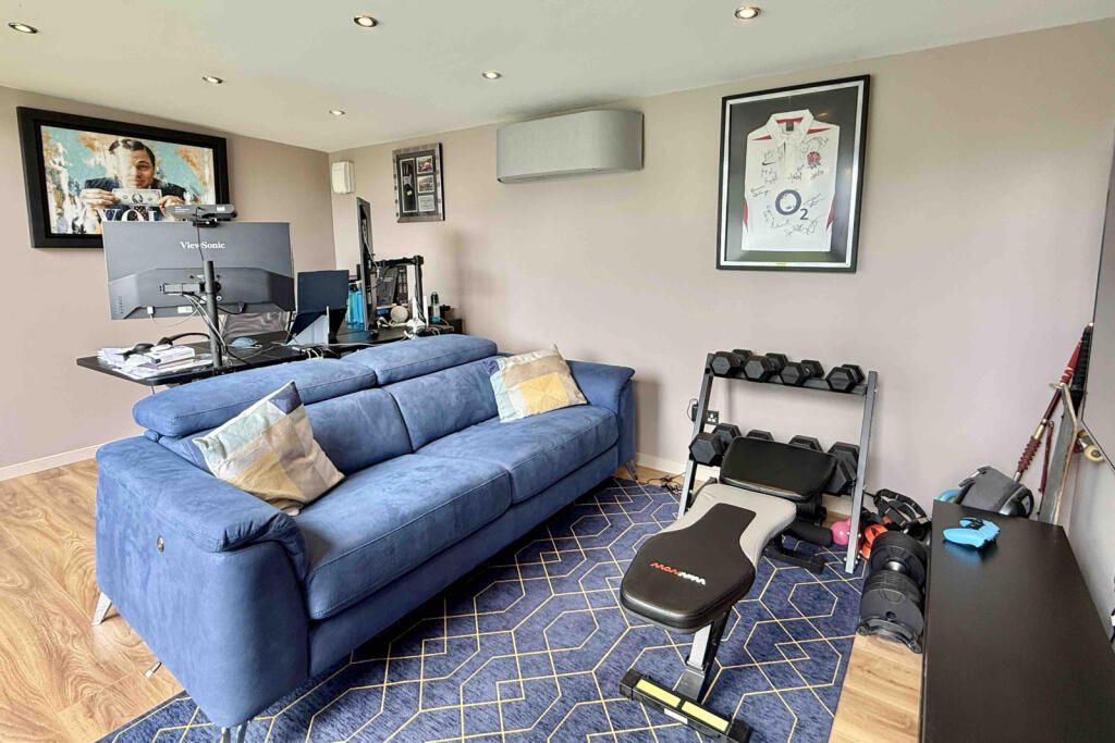 The rear garden has been thoughtfully designed to be easy to maintain and is perfect for outdoor entertaining al fresco dining. It is enclosed by panel fencing and offers unexpected levels of privacy and seclusion. There is a large decked and sandstone paved seating area, realistic artificial lawn and superb 4.8m by 2.8m, insulated home office gym. It has power light and air conditioning, as well as bi fold doors.