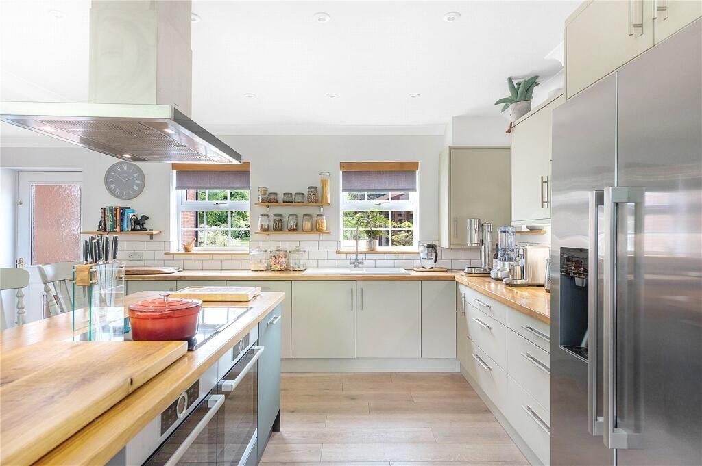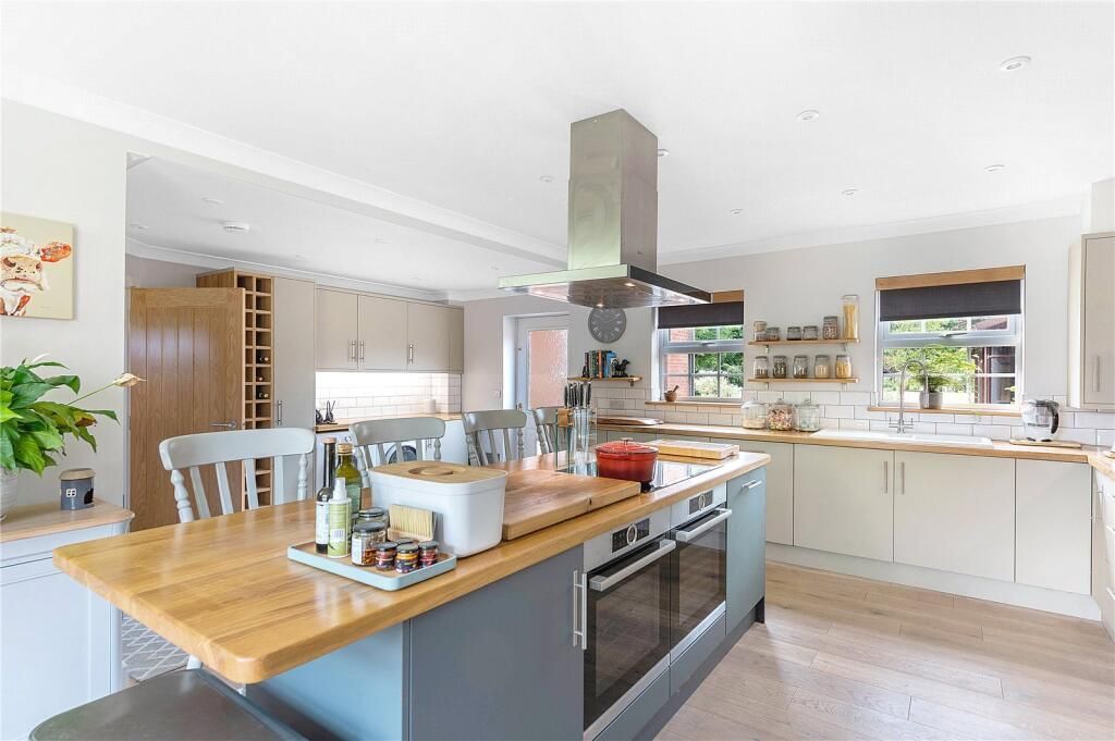 The kitchen breakfast room is extensively fitted with a modern range of painted units, with an oak worktop throughout, including the matching island unit, where can be found the induction hob with hood above, and twin Bosch ovens, also within the kitchen is a further Bosch combi microwave oven, warming drawer, dishwasher and a plumbed in American style fridge freezer. Completing the kitchen is a utility area, with an oak wine rack, plumbing and space for both washing machine and tumble dryer. Completing the ground floor is the cloakroom is half tiled, vanity wash basin with pillar fill and storage below, low level WC be sure to look up at the ceiling.