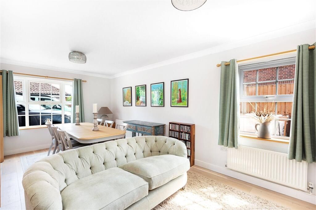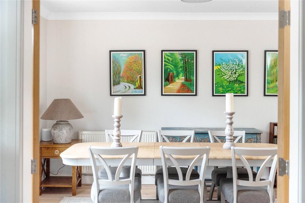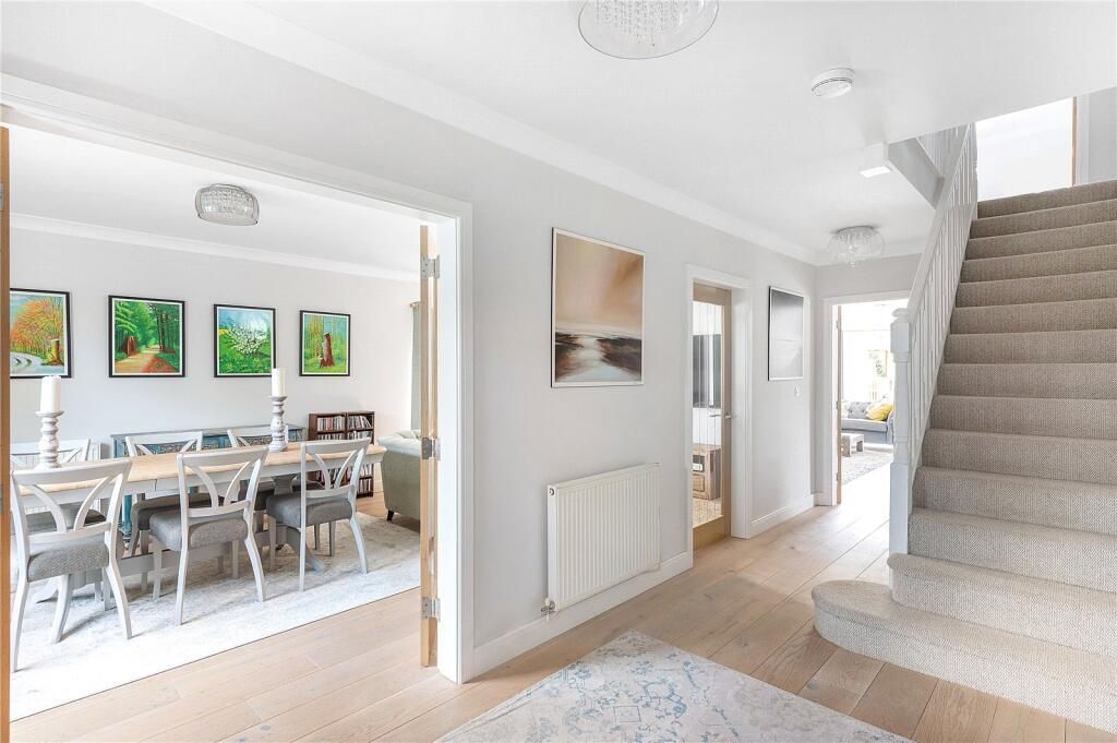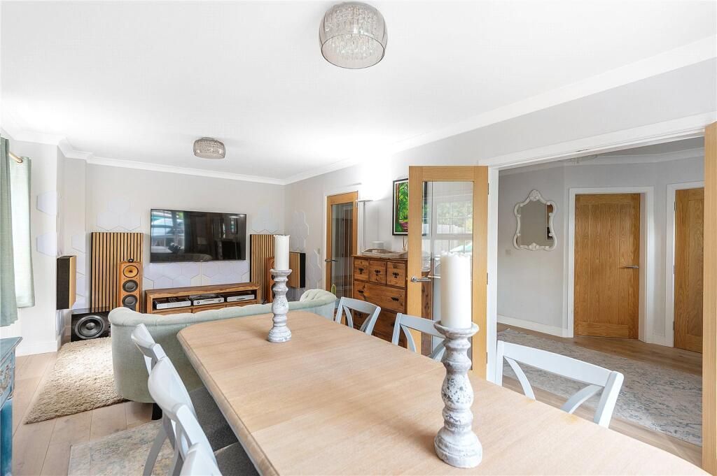 On entering the property, you are greeted by wide boarded oak floor, which is a feature throughout the ground floor. The entrance hall gives access to the left through a pair of French doors to the double aspect dining room music room. To the rear of the property is the large rear sitting room, this double aspect room has French doors to the rear garden and a large feature inglenook fireplace with bressummer beam and central wood burning stove.