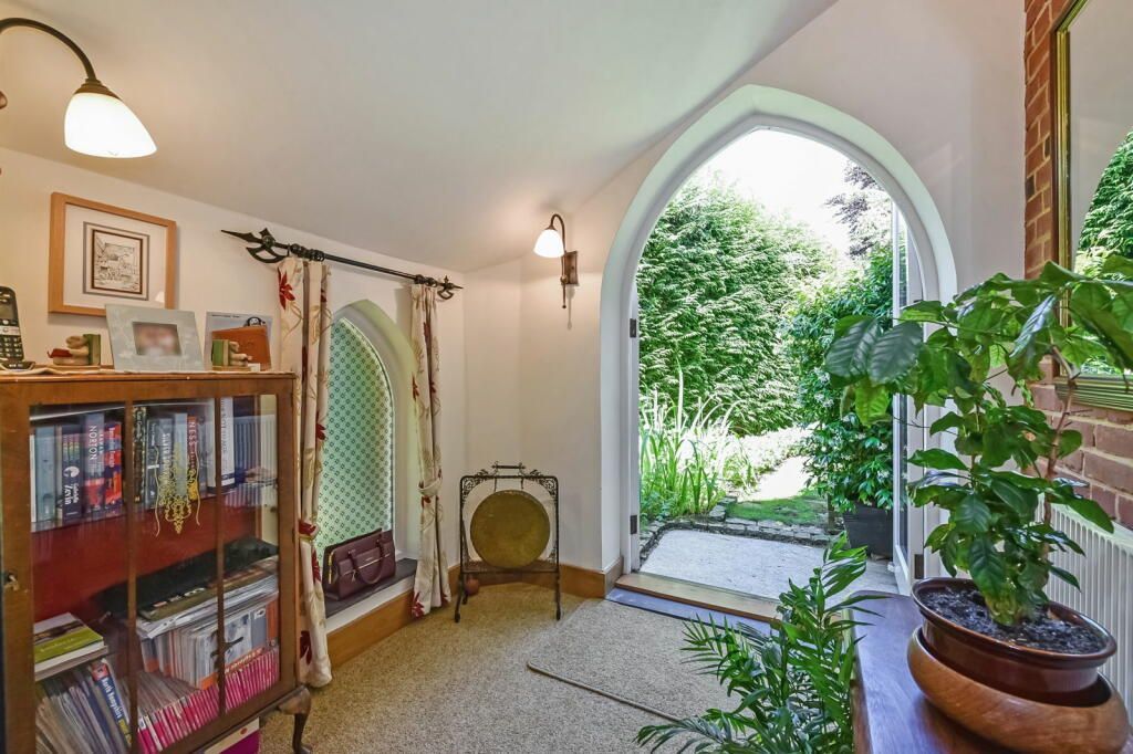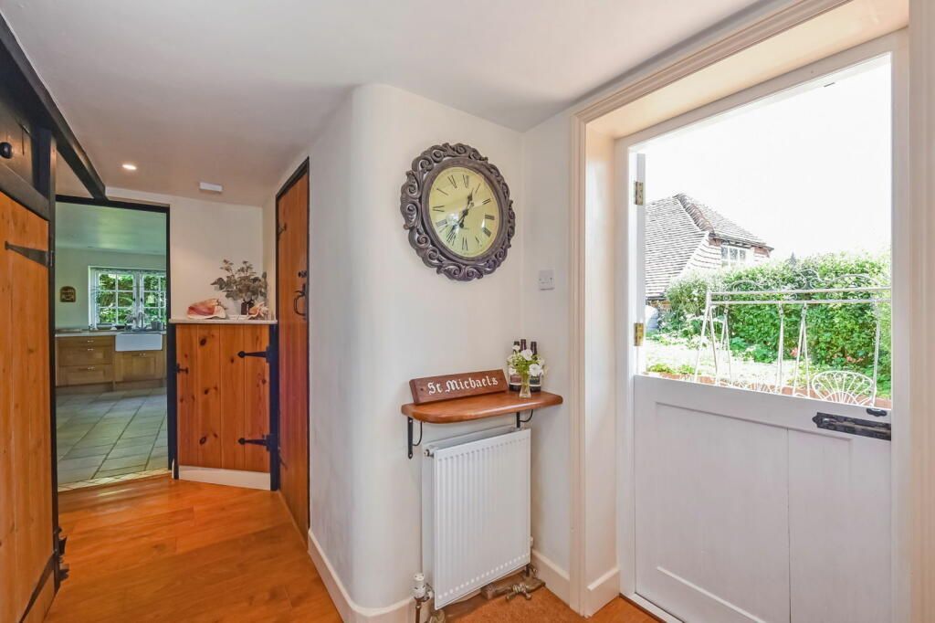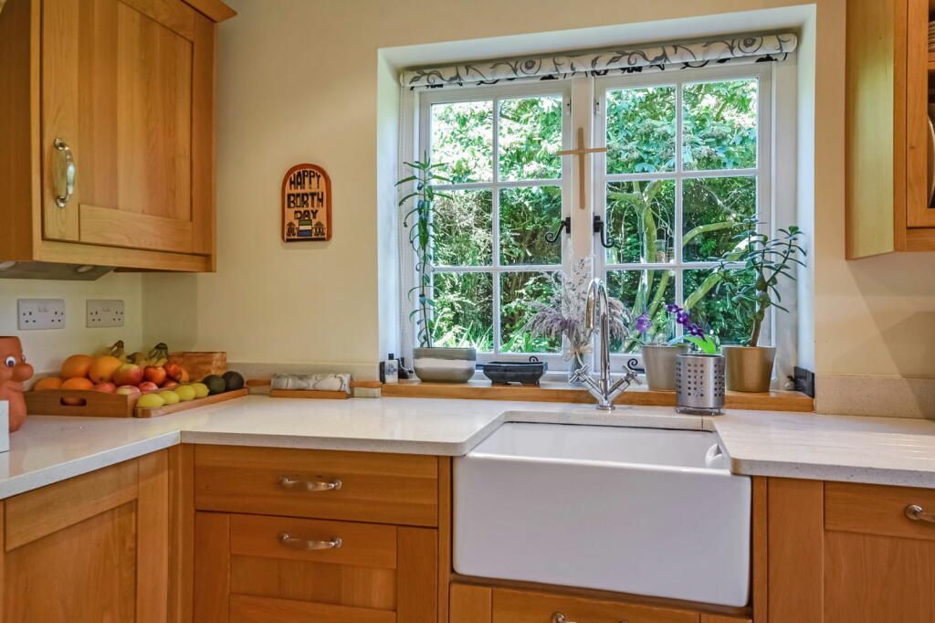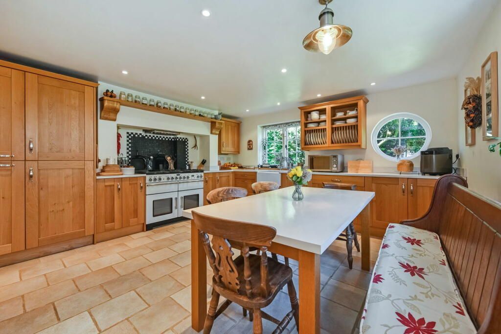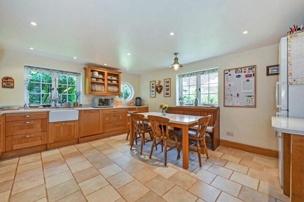 The property itself is accessed via a gravel driveway enclosed by picturesque flint walls, mature shrubs and with ample space to park multiple cars. Once inside the house you are greeted by a spacious entrance hall and the more you look the more unique period features you notice. As you enter, there is a study to your left, the sitting room is ahead with open fire and exposed oak beams adding to the ambience, and a further dining room snug with log burner. The entrance hall also leads into the kitchen and benefits from having a WC and convenient utility room. The kitchen is finished in a charming traditional farmhouse style with a variety of storage units, marble worktops, Rangemaster cooker, butlers sink and plenty of space for a family sized table.
