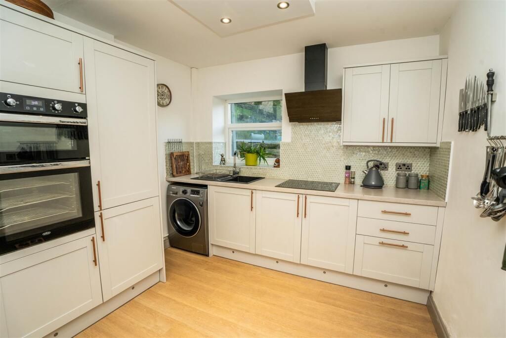 A great selection of modern fitted wall, drawer and base units with worksurfaces incorporating an inset sink with mixer tap and drainer. Built in electric double oven, hob and extractor fan. Built in fridge freezer. Space and plumbing for a washing machine. Plinth lighting. Partially tiled walls. Recessed ceiling downlighters. Radiator. Laminate flooring.