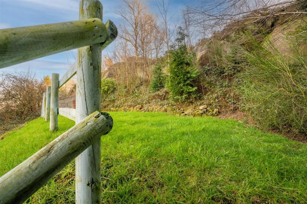 Exterior Gravel driveway and Garage to the side with steps leading up to the elevated property with a lawned garden and gravel border. Paved path to the side leading to the rear where there is a small courtyard, steps leading to a barked seating area with glass fence panels. The rest of the rear garden is tiered with lawned and rockery areas with well stocked plants and shrubs and has incredible countryside views.