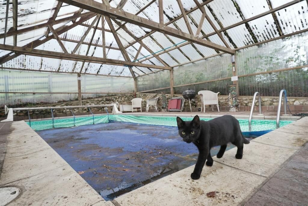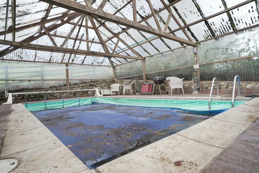 Swimming Pool Set behind the house, the swimming pool is now in need of some renovation. Beside the covered pool is a filtration system.