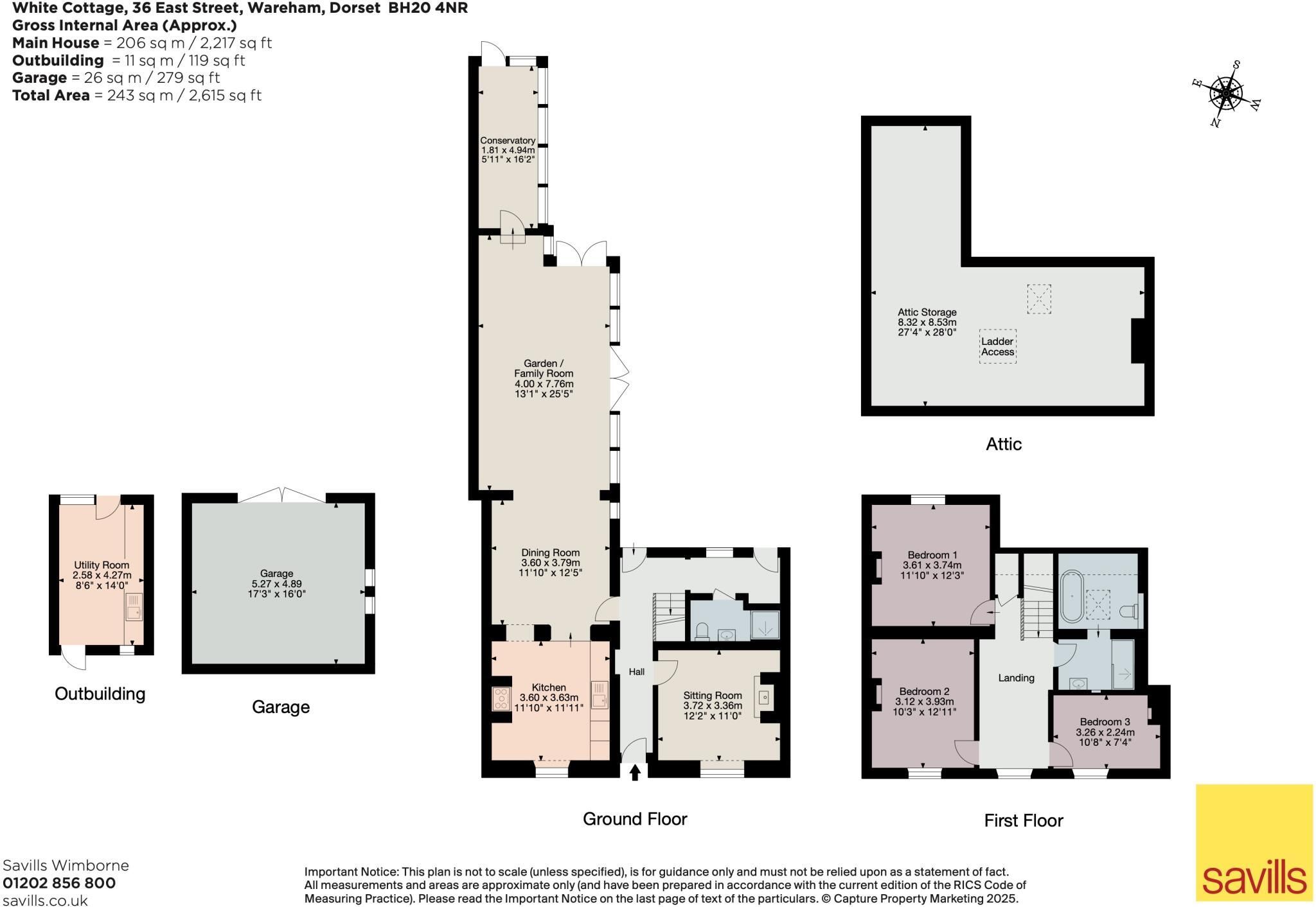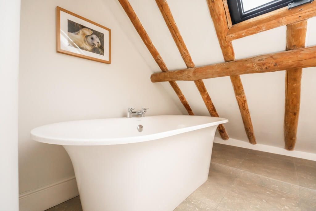 Stairs lead up to the generous first floor landing, with ladder up to a useful attic storage room with roof window. There are three bedrooms, two doubles and a single, plus the modern family bathroom arranged in two areas, with a basin, WC, freestanding bath and separate walk in glazed shower.