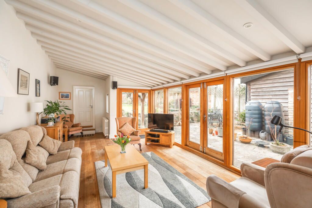 The half glazed front door opens into the entrance hall with tiled and wood flooring. The cosy sitting room has a brick fireplace with log burner, and oak flooring. The kitchen, dining room and garden room all interconnect to provide a large open plan space suited to modern living. The kitchen is at the front, and is fitted with a range of modern units in stainless steel and glass, a range cooker set into a tiled recess with cooker hood over, oak flooring and a traditional cast iron radiator. This opens into the dining room with Purbeck stone floor and then through into the impressive garden room with vaulted beamed ceiling, oak floor to ceiling, windows and two pairs of French doors to both the courtyard and terrace.