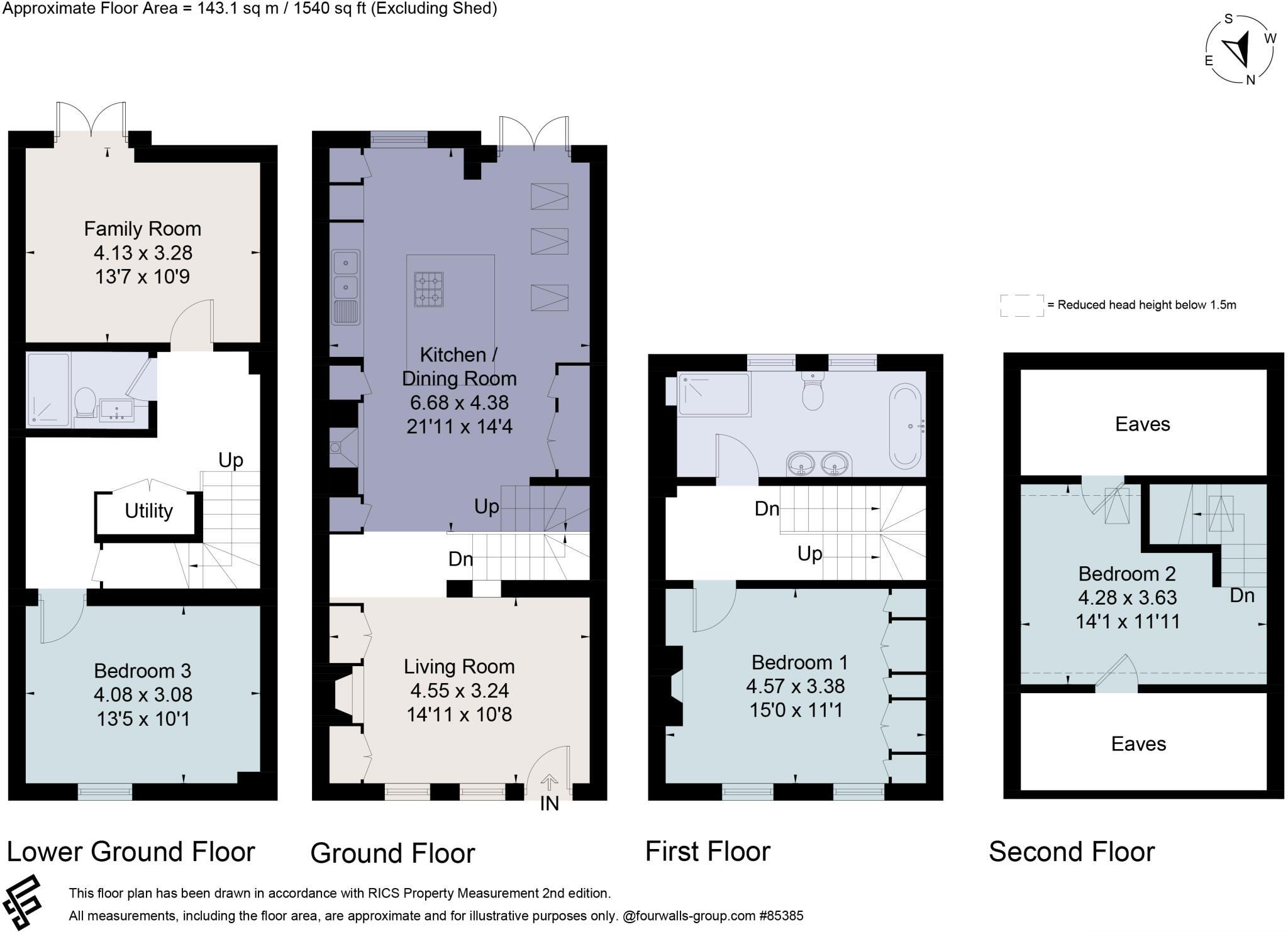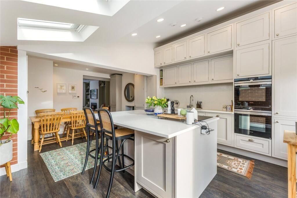 The ground floor features a cozy living room with a fireplace and underfloor heating, leading to a spacious, light filled kitchen dining area with a quartz island and vaulted ceiling. Double doors open to a south facing garden. The lower ground floor has two double bedrooms one ideal for a home office , a shower room, and direct garden access. The first floor includes a large master bedroom and a stylish family bathroom with a freestanding bath and walk in shower. The top floor offers another double bedroom with remote controlled Velux windows.