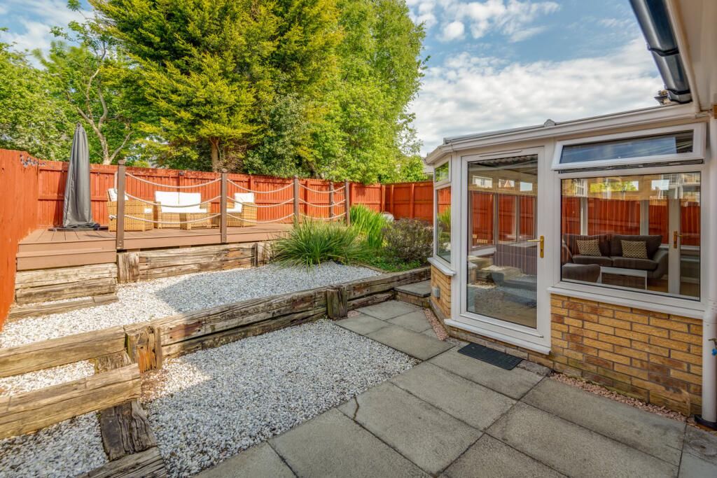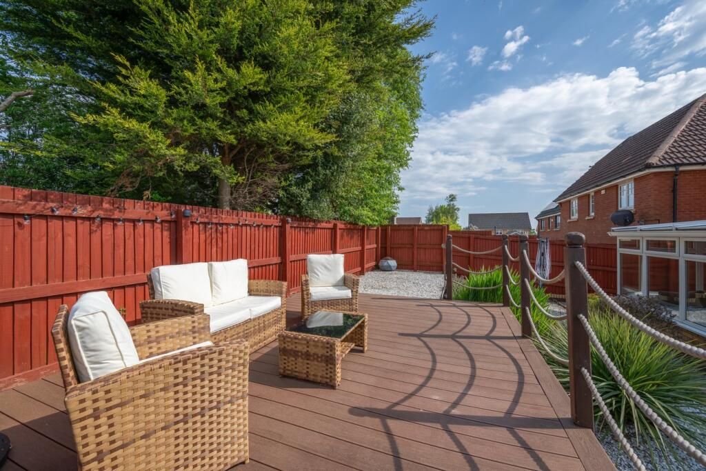 Lovely, well maintained gardens to the rear with a raised deck, perfect for enjoying the summer sun. Driveway with parking for several cars and single garage.