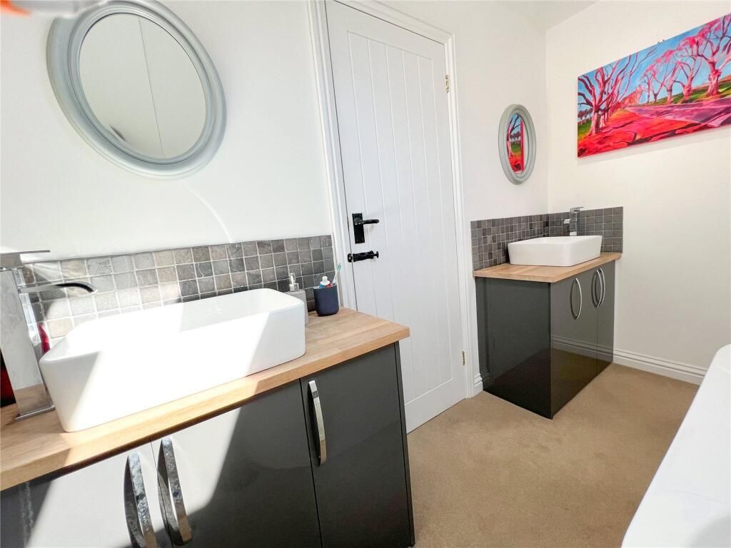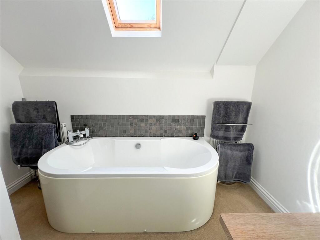 The Bathroom Suite comprises a curved bath with corner mounted mixer tap shower attachment and twin vanity wash hand basins set on separate plinths with cupboard storage under. Natural light provided by the Velux window.