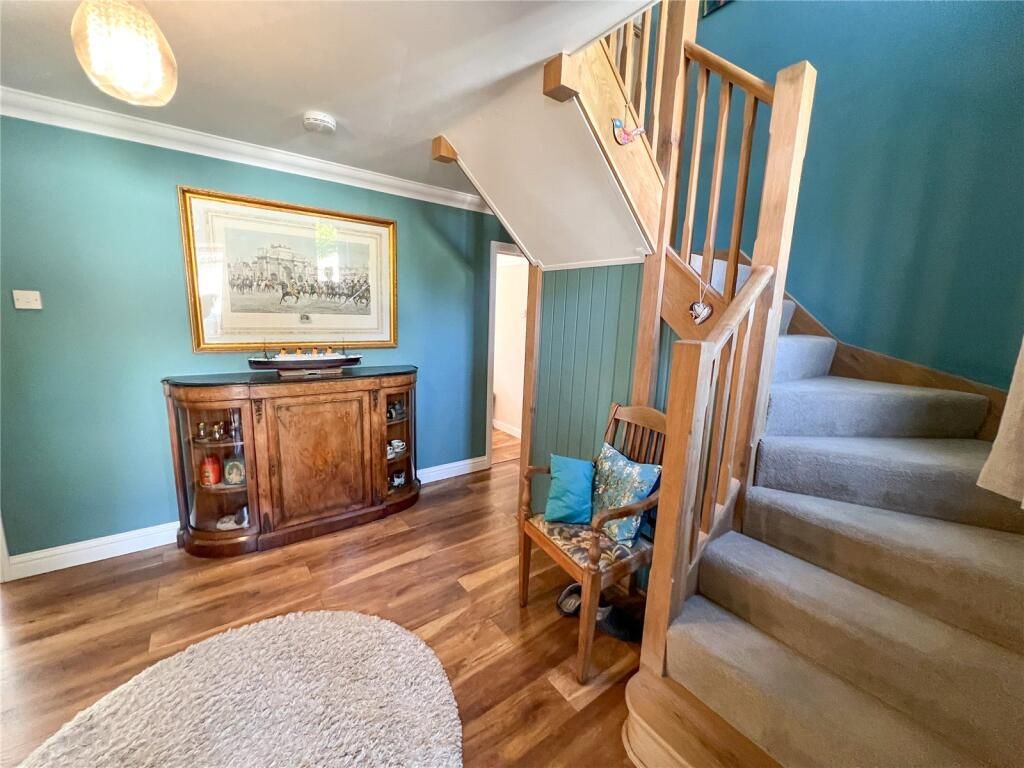 The Entrance Porch with tiled flooring and wall mounted storage in turn leads to the Reception Hall, of generous proportions with an impressive staircase extending to first floor, with cupboard storage under. Laminate flooring extends to the majority of the ground floor and the Shower Room Suite comprises a fully tiled shower enclosure with circular vanity wash hand basin set in a hard wood plinth with cupboard storage under. Low level WC.