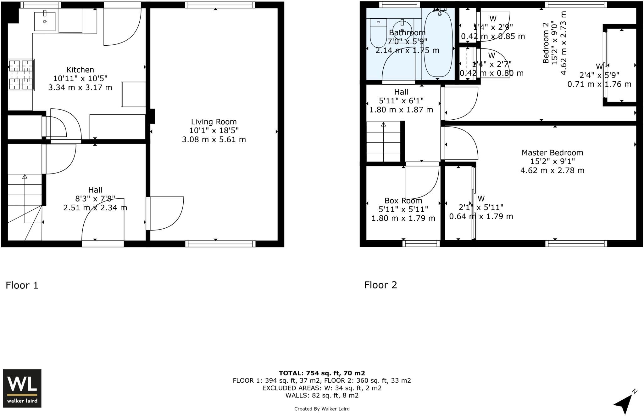 Upstairs comprises two double Bedrooms which both have fitted storage; useful Box Room; and a Bathroom featuring a modern white suite, electric shower and finished with wet wall panelling.