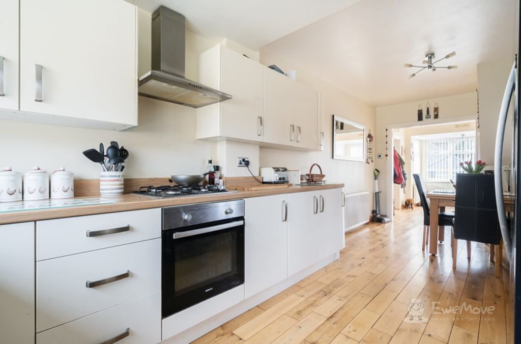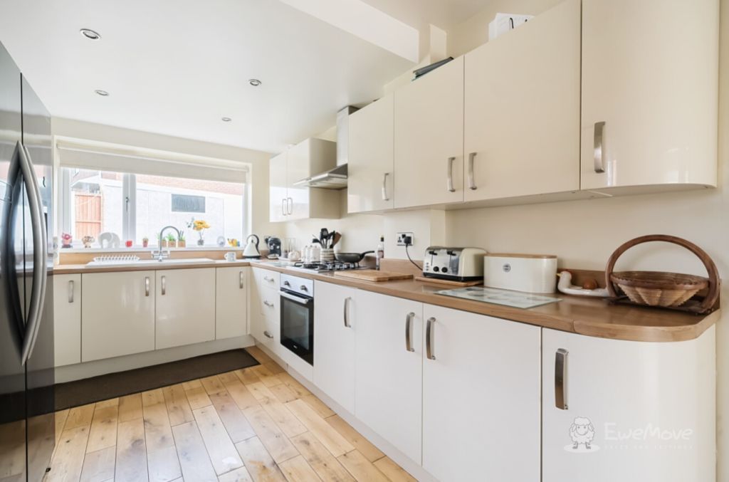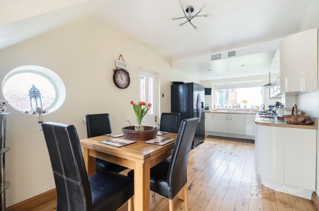 Adjacent to this is the expansive open plan kitchen diner. The wooden flooring pairs seamlessly with the counter worktops, combined with the neutral colour palette, creating a refreshing modern atmosphere. There s plenty of surface space to allow you to prepare meals and locate all your smaller appliances, from coffee machines to air fryers, microwaves, kettles and toasters. This room also comes with an attached porch, which offers you quick and easy access out to the side of the property.