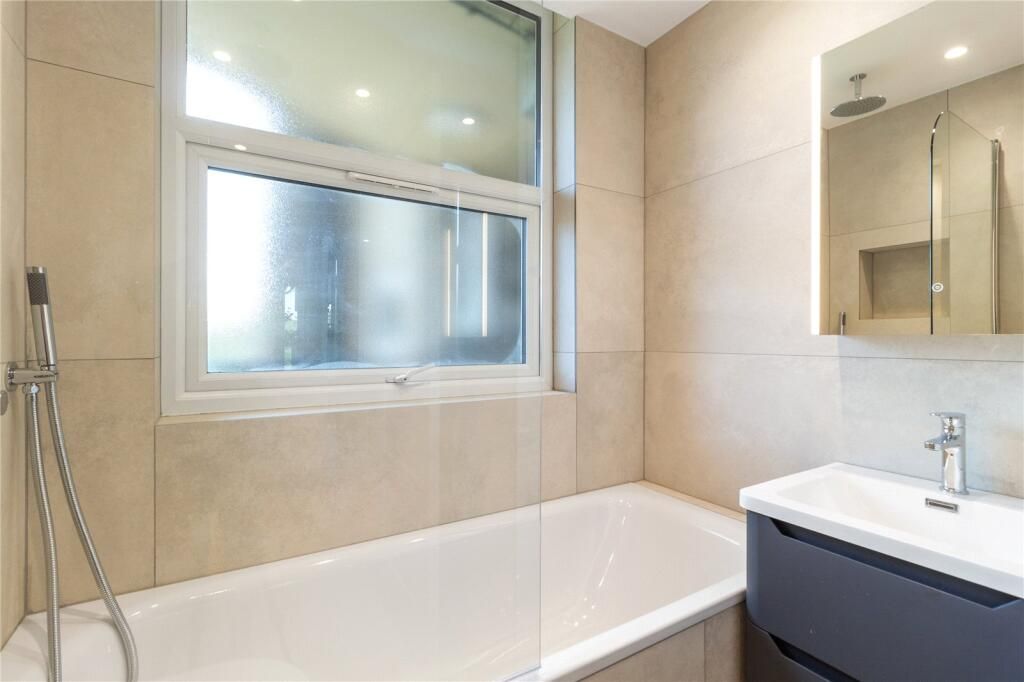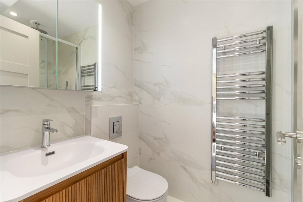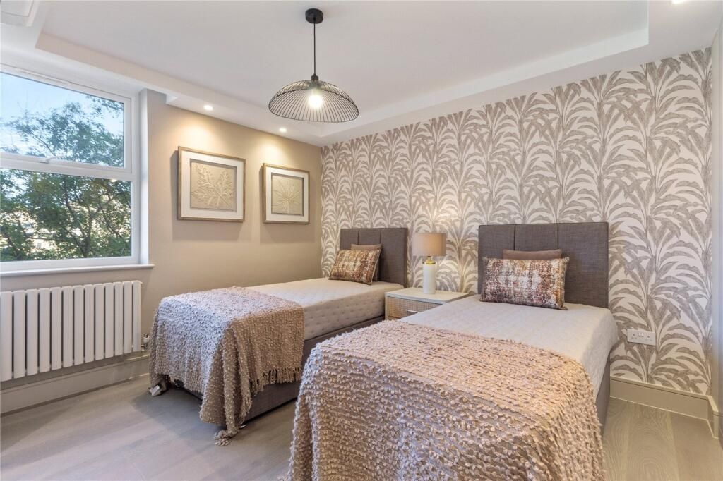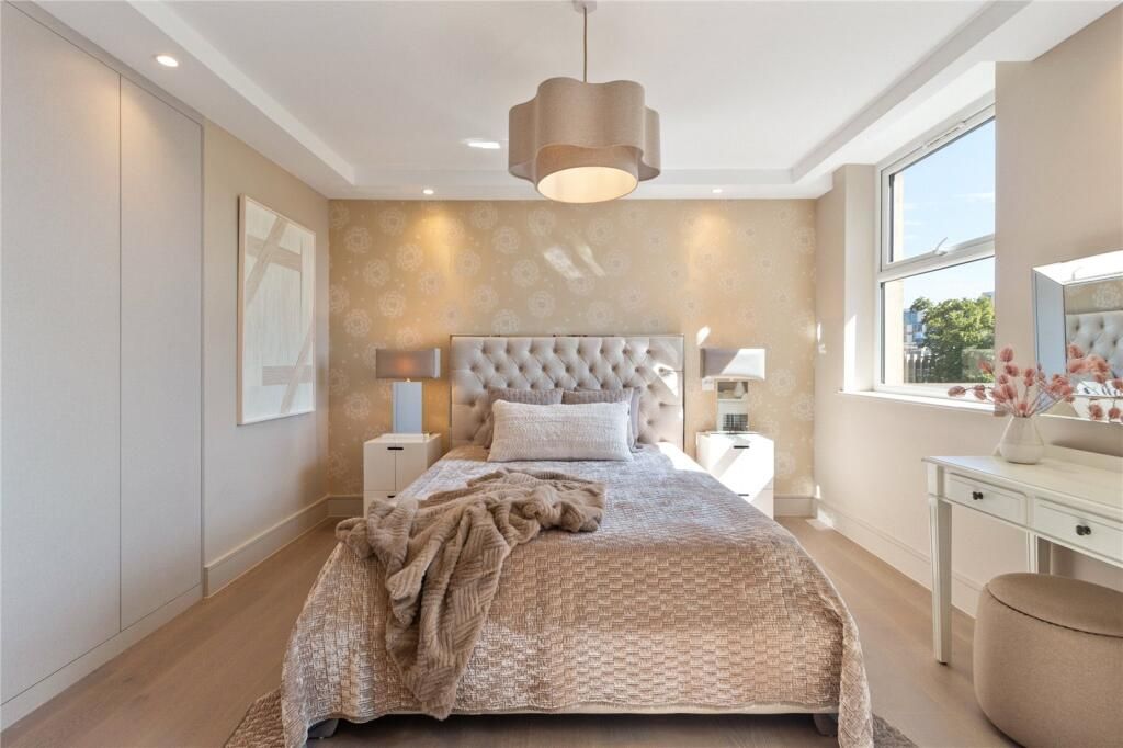 This 1,097 sq ft 101.9 sq m apartment features a spacious reception and dining area, a separate fully fitted kitchen, and three double bedrooms, each with its own en suite bathroom. The property has been finished to a high specification throughout, including herringbone wood flooring and air conditioning.