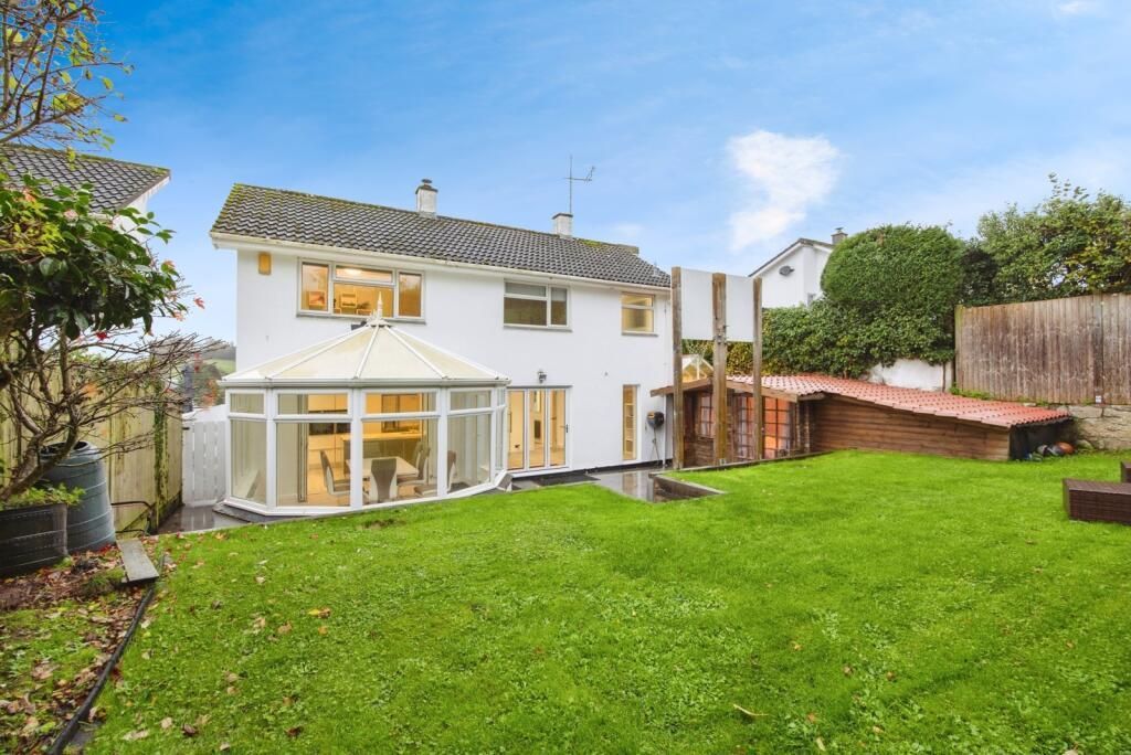 "An immaculately presented, generous, detached four five bedroom house complete with enclosed garden, double garage, wooden chalet with sauna and raised seating area to the front to enjoy the countryside views within the popular area of Tregrehan Mills.